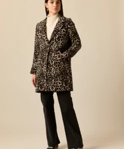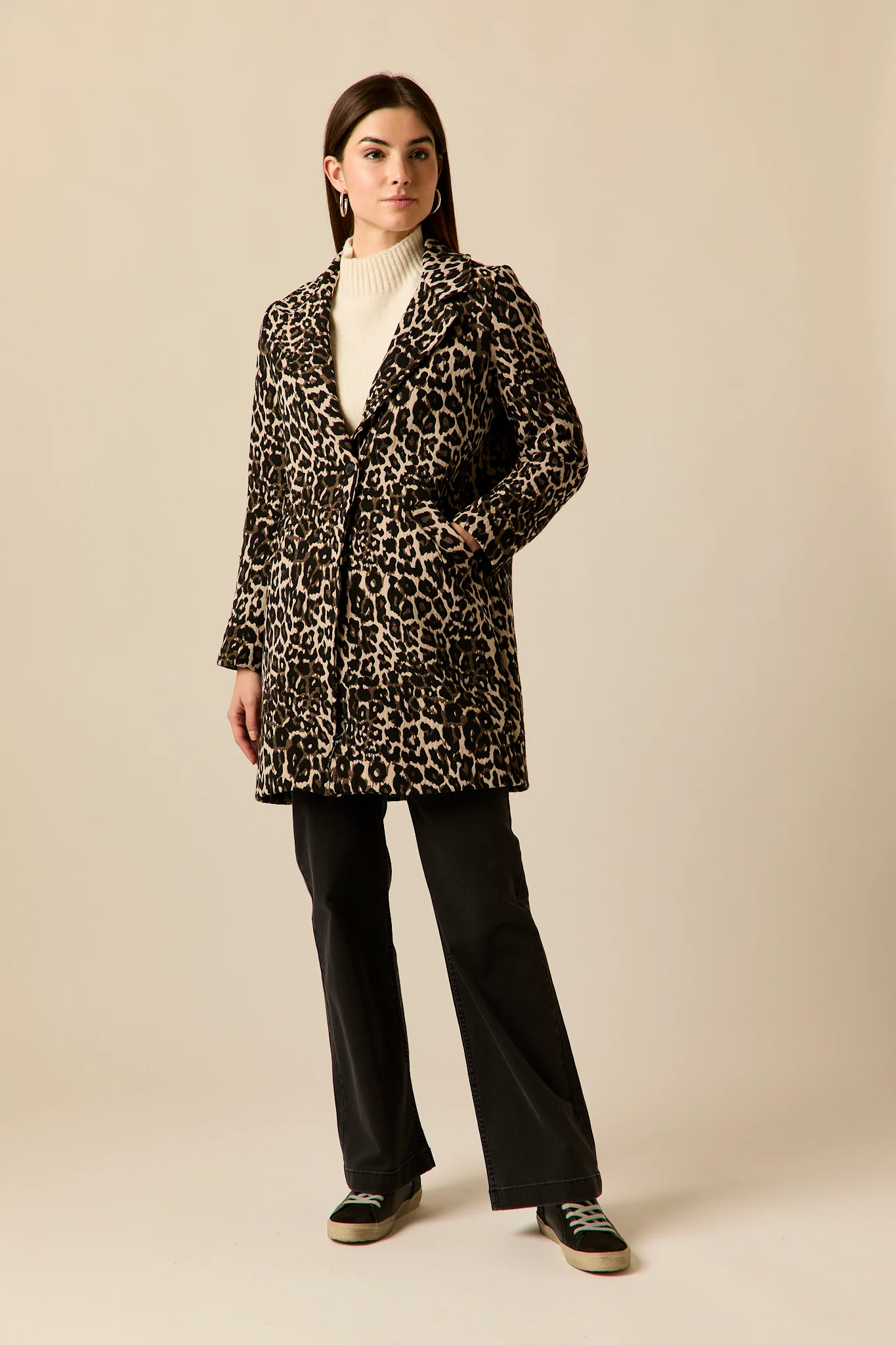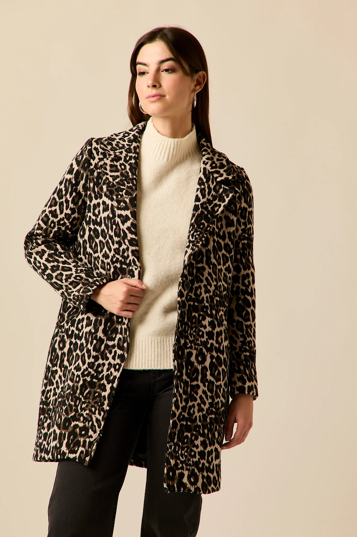 Abrigo jacquard de animal print en tonos marrones. Cuello de solapa, manga larga, bolsillos laterales en vivo. Forro interior y cierre frontal de un botón.