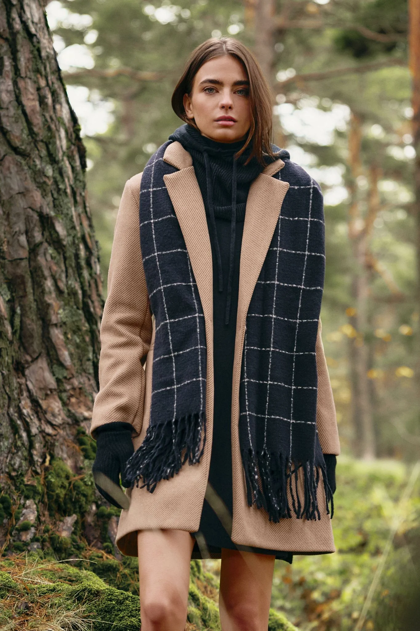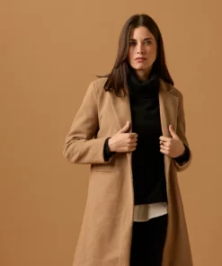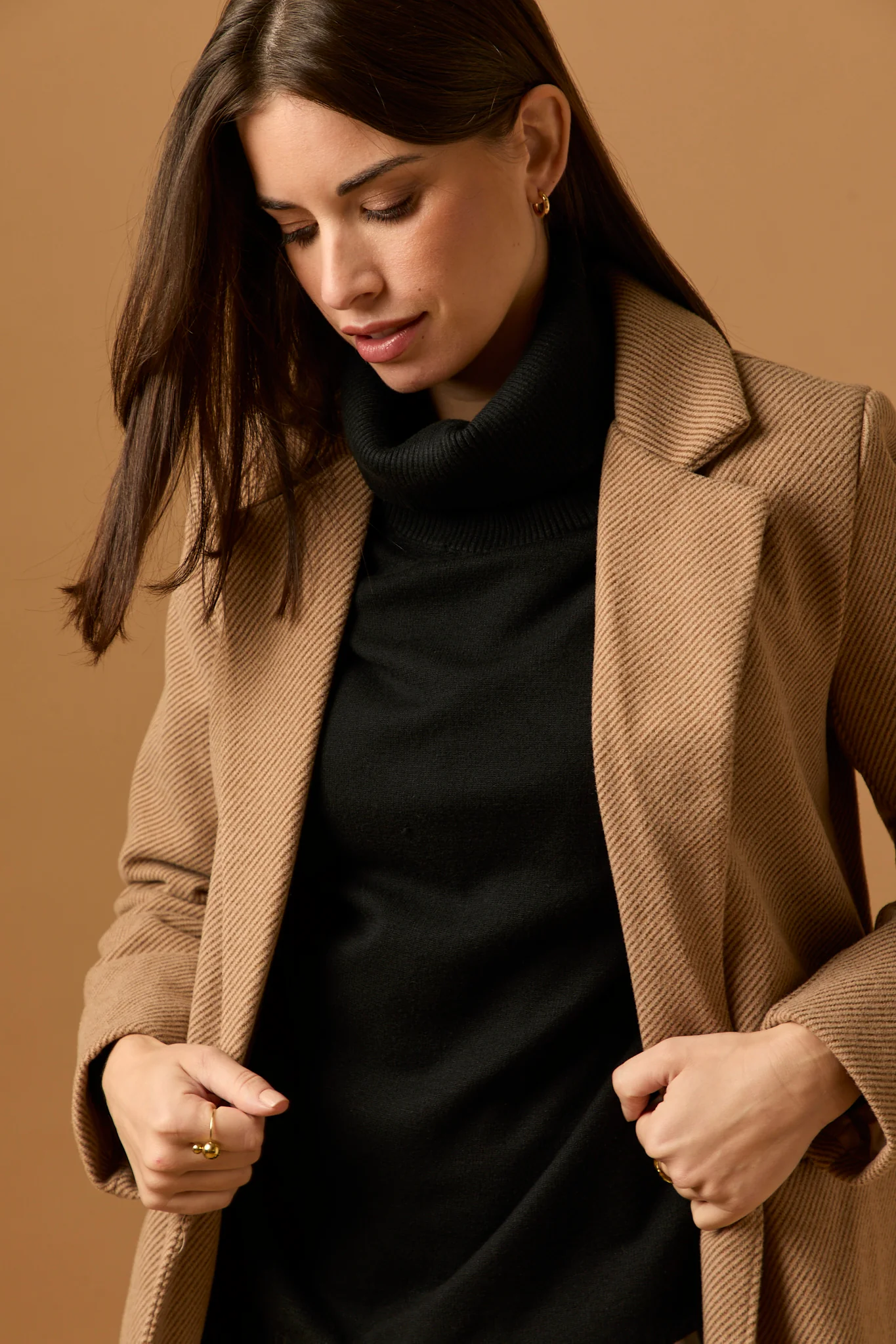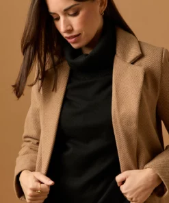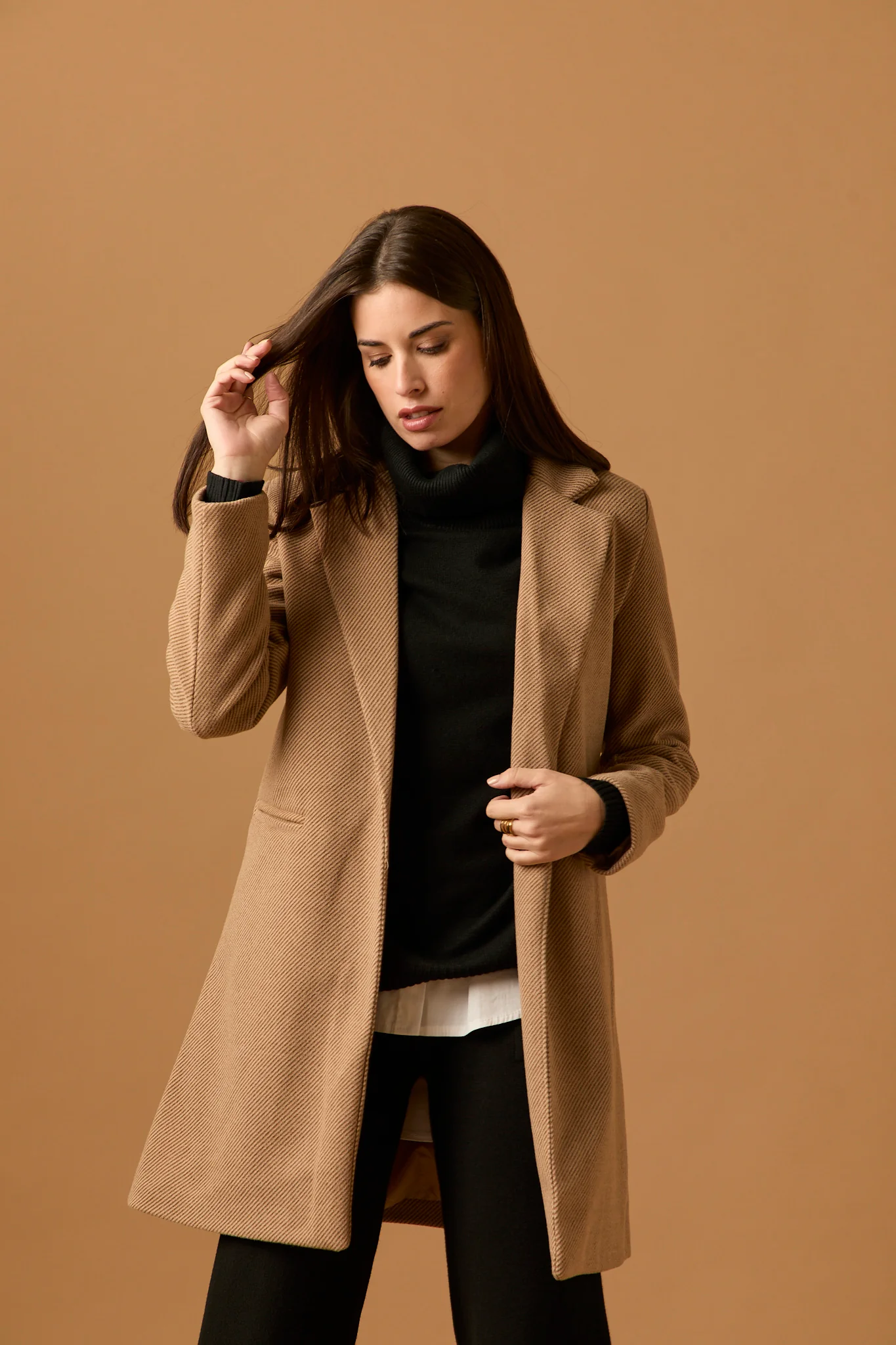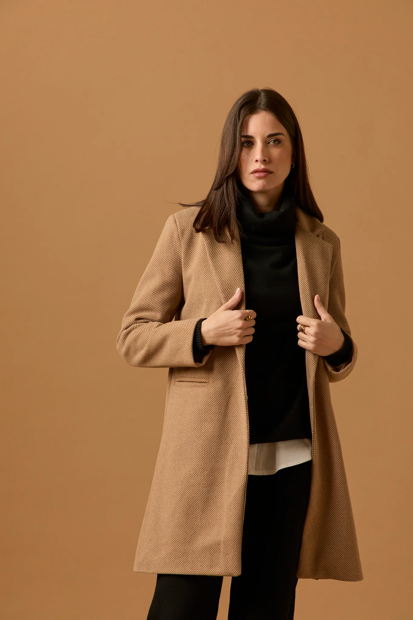 Abrigo clásico de estampado espiga en color camel. Cuello de solapa, manga larga, cierre de un botón y detalle de falsos bolsillos laterales.