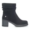Estos botines negros de tacón bajo para mujer combinan comodidad y estilo en un diseño elegante. La correa decorativa añade un toque moderno, mientras que la puntera redondeada y el cierre lateral con cremallera ofrecen practicidad. Con un tacón de 3 cm, son ideales para largas jornadas.