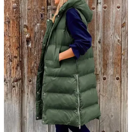 Este chaleco largo de algodón con capucha es la prenda perfecta para mujeres que buscan estilo sin sacrificar comodidad. Su diseño de color puro y corte relajado te ofrece versatilidad para combinar con cualquier outfit, ideal para los días frescos o como capa adicional en invierno.