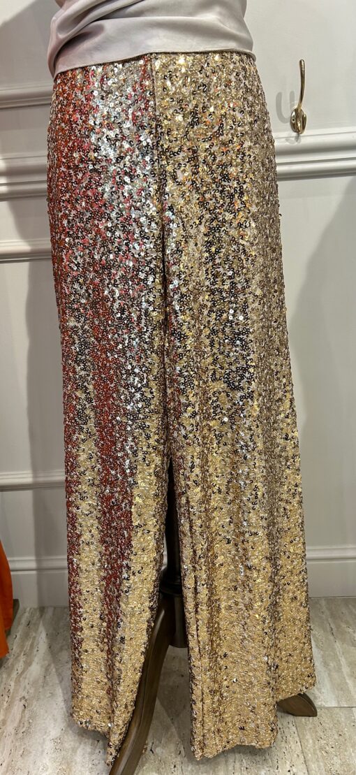 Pantalón de lentejuelas dorado, modelo de talla unica, válido para una talla M, L.